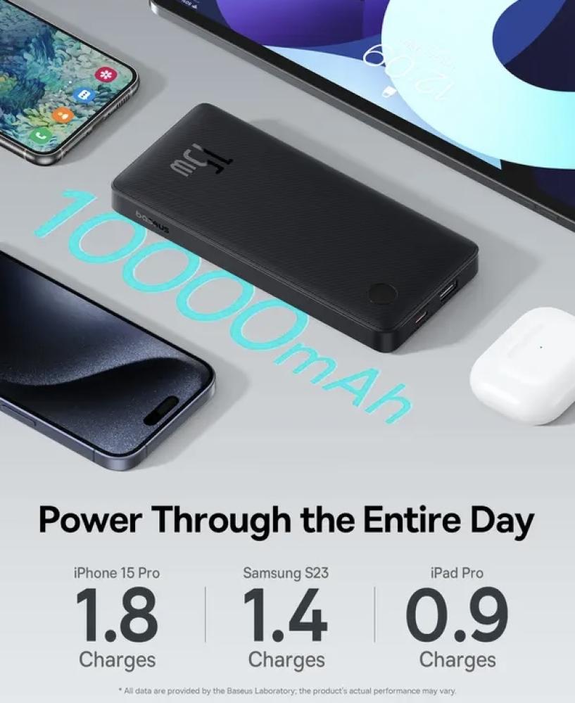 سعة عالية: بطارية 10,000 مللي أمبير تشحن iPhone 15 Pro Max حتى 1.8 مرة، وأجهزة Android حتى 1.4 مرة، وiPad Pro حتى 0.9 مرة. مثالية لحالات الطوارئ والرحلات الطويلة.