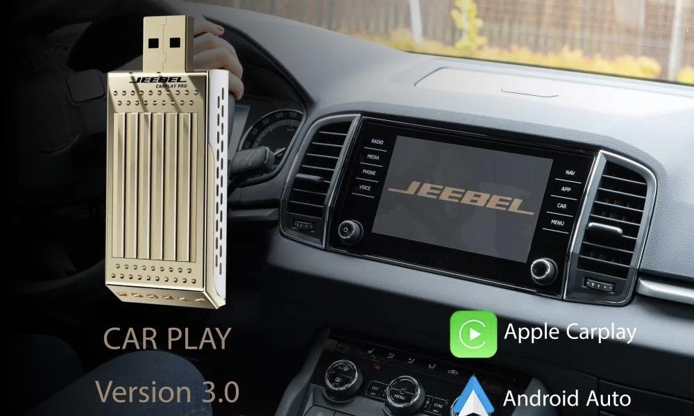 استمتع بتجربة قيادة أكثر ذكاء وأناقة مع محول Jeebel CarPlay Pro – JE-B386 الذهبي.
